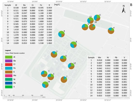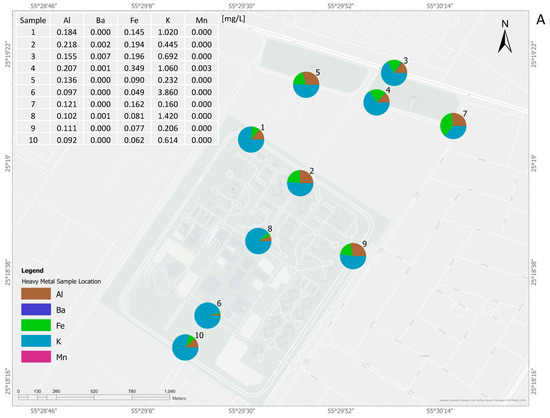 The distribution of the metals in the stormwater (Figure 2) indicates high levels of Al, Fe, and K in all the monitored stormwater samples. In addition, increased Ba and Mn concentrations (still below 0.1 mg/L) were observed during the second sampling event. Stormwater pollution typically originates from pavements, the wheels or other parts of a car, overflowing water from nearby land areas, nearby construction sites, and atmospheric conditions. The study site was maturely constructed during the stormwater events, except for a few renovation projects within the American University of Sharjah and outside. The high Al concentration could be from the wheels of cars, nearby construction sites, and aluminum sulfate used as a fertilizer in the green areas outside the road network. The presence of high Fe levels could be caused by construction sites, fertilizer, iron fillings on roads, and cars. Furthermore, the elevated levels of Fe and Al in the stormwater could be partially attributed to the local soil composition. The study area, located in the UAE, is characterized by sandy soils rich in silicate and aluminosilicate minerals, which naturally contain Fe and Al. During intense rainfall and flooding, these particles can be mobilized into the runoff. Similar findings have been reported in studies on desert soils in the region []. The high K level may originate from fertilizers []. Urban stormwater quality is influenced by pollutants originating from both ground-based sources and atmospheric (airborne) contributions []. Ba can typically be found in brake dust []. Mn is naturally available in sediment and rocks. In these stormwater samples, they may originate from overland flow or from some automobile parts and fluids. Since the concentrations were not very high, it is hard to predict the actual source of Mn.