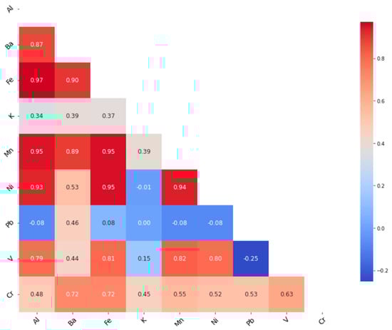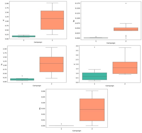 Figure 3 shows that Campaign 2 had higher values of Al, Ba, Fe, K, and Mn than Campaign 1. However, these differences needed to be further assessed statistically to determine whether they were significant. The Mann–Whitney test was conducted for this purpose, revealing that the differences between the two campaigns in terms of Al, Ba, Fe, K, and Mn concentrations were all significant, as depicted in Table 1.