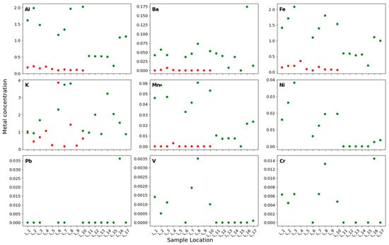 Scatterplots for the distribution of each metal concentration in mg/L among 17 different locations and 2 campaigns: Campaign 1 (n = 10) (red dots) and Campaign 2 (n = 14) (green dots).