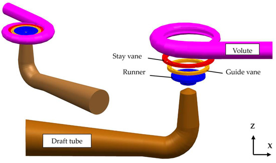 This study focuses on experimental investigations conducted on a pump-turbines operating within the scaled-down test platform for pumped storage units at the Pumped Storage Engineering Technology Research Center, Zhejiang University of Water Resources and Electric Power. Concurrently, three-dimensional geometric models of all pump-turbine components were developed using NX UG 12 software. Each component pump-turbine model was assembled to construct the entire fluid computational domain. The computational domain comprises five components, namely the spiral casing, stay vanes, guide vanes, runner, and draft tube. The complete computational domain is illustrated in Figure 1, and the key geometric parameters of each component are listed in Table 1.
