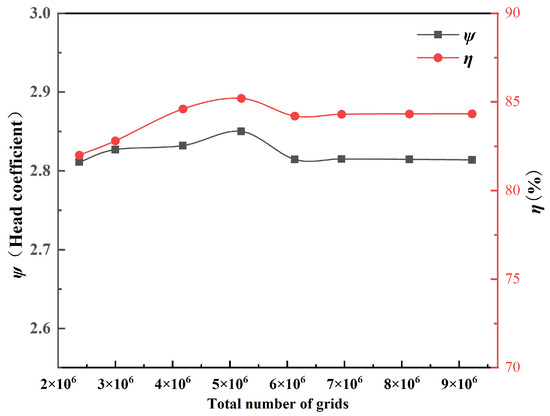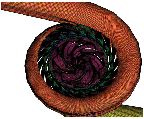 Grid independence verification was performed to ensure computational accuracy and precision by evaluating eight sets of grids with varying dimensions. Under guide vane opening conditions of 11°, validation across the entire computational domain was conducted at the pump operating point of maximum efficiency, with head coefficient and efficiency selected as evaluation criteria. As shown in Figure 2, the grid independence verification results indicate that, when the grid count increases from 2,368,511 to 5,857,496, the head and efficiency exhibit significant variations. Further increasing the grid count to 9,227,089 reduces the computational errors of head and efficiency to within 4%. While high-quality grids yield more reliable numerical results, higher grid counts demand greater computational resources and longer simulation cycles. Therefore, given the precision requirements, the model with 5,857,496 grids was selected for subsequent numerical simulations. The computational grid is presented in Figure 3. The quality metric refers to the minimum orthogonal quality of the grids, with a value range of 0–1. Values closer to 1 indicate better mesh orthogonality. In this study, all computational domains achieved orthogonal quality values above 0.3. Detailed parameters for whole grid component are listed in Table 2.
