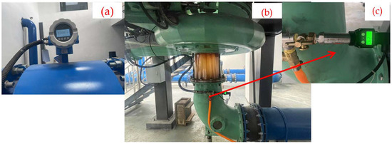 Test bench for pump-turbine units and measurement facilities: (a) electromagnetic flowmeter, (b) pump-turbine, (c) pressure sensor.