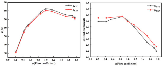 Model tests of the pump-turbine were conducted on two actual pump-turbine test units at the Pump-Turbine Test Facility of the Water Storage and Hydropower Engineering Technology Research Center of Zhejiang University of Water Resources and Electric Power, as shown in Figure 4. The comprehensive efficiency test error of the actual test bench machines was no more than ±0.25%. The external characteristics under an open angle of 11° of the movable guide vanes were compared with the results from the numerical simulation. The comparison situation is shown in Figure 5. The head and efficiency values derived from the numerical simulation exhibited excellent agreement with the experimental measurements, demonstrating minimal deviation at the optimal operating point. The numerical simulation error of the head was less than 5% at each flow condition point; the maximum error of the efficiency was 5.3%, occurring at the minimum flow condition point, and the errors at the other condition points were all within 5%. The results indicate that the numerical simulation results have good accuracy. Table 3 summarizes the measurement instruments and their specific parameters.