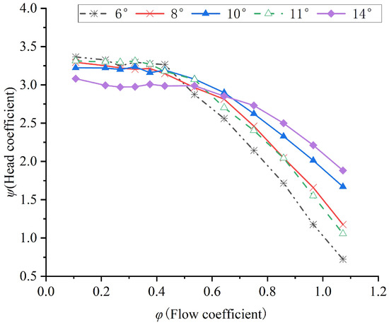 Experimental analysis of the pump-turbine’s external characteristics under different guide vane openings in pump mode yields hump characteristic curves for various openings. As shown in Figure 6, distinct hump characteristics appear under small flow conditions across all guide vane openings. Notably, the hump occurrence positions vary as flow increases. With decreasing guide vane openings, the pump head in the low-flow region progressively rises, the slope of the head curve becomes steeper, and the hump phenomenon intensifies.