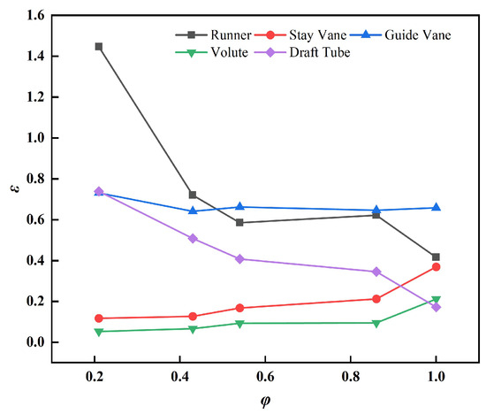Figure 8 shows the distribution of the proportion of entropy generation for each component. From Figure 8, it can be seen that, at the hump region curve operating conditions, the entropy generation losses of the runner and the guide vanes account for a relatively large proportion. In the draft tube, the entropy generation loss decreases with the increase in flow rate, while in the volute, the trend is opposite. Within the flow coefficient range of φ = 0.43–0.86, the proportion of entropy generation losses of the runner and the double-row cascade does not change much. Within the range of φ = 0.86–1, the entropy generation loss of the runner decreases with the increase in flow rate, and the total proportion of entropy generation losses of the double-row cascade gradually increases, from 45% to 66%.