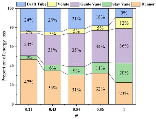 The energy losses of the draft tube, runner, movable guide vanes, and fixed guide vanes, as well as the volute components under different flow conditions, are shown in Figure 7. From Figure 7, it can be seen that the energy losses occurring in the runner and the double-row cascade dominate, accounting for 72% to 86% of the total energy loss. With increasing flow rate, energy loss exhibits abrupt variations at hump region operating conditions. From the larger flow point to the optimal operating point (φ = 0.86–1), energy loss in the double-row cascade tends to rise progressively, contrasting sharply with the substantial reduction observed in the runner. The draft tube has a larger energy loss under small flow conditions and is relatively sensitive to flow changes. As the flow increases, the energy loss of the draft tube continuously decreases and reaches the minimum at the optimal efficiency flow point. On the contrary, the energy loss of the volute changes significantly under large flow conditions and is small. with relatively gentle change, under small flow conditions.