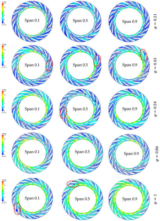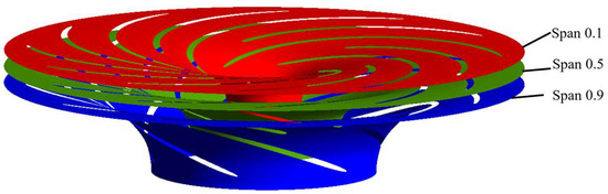 In the runner region, a two-dimensional plane is obtained by unfolding along the spanwise direction. Span denotes the dimensionless span value along the flow plane perpendicular to the mainstream. The cross-sectional positions at different blade heights of the runner are clearly indicated in Figure 9. Three spans (Span 0.1, Span 0.5, Span 0.9) are selected to represent three stream surfaces: near the front shroud, the middle region, and near the back shroud of the runner.
