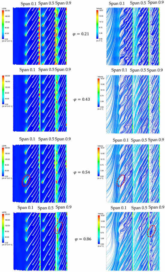 Figure 11 and Figure 12, respectively, show the LEPR and streamline distribution at different spans of the dual-blade-row cascade. In Figure 8, it is observed that, under various flow coefficients, the LEPR values are notably higher in the regions of the guide vanes and portions of the stay vanes. In Figure 8, when φ = 0.21–0.54, the area of energy loss distribution exceeds that of other operating conditions. At φ = 0.21, the maximum LEPR intensity occurs predominantly at the guide vane region of Span 0.1. The indicates that energy losses are primarily concentrated adjacent to the guide vane crown, with high LEPR mainly distributed at the guide vane leading edge and trailing edge. As flow rate increases, when φ = 0.43, entropy loss begins to shift from the vaneless region between guide vanes to the flow passages of stay vanes. Entropy distribution concentrates primarily in the vaneless space between guide vanes and stay vanes at Span 0.5. Meanwhile, high LEPR values are localized at the trailing edges of guide vanes at Span 0.1 and Span 0.9. It is primarily attributed to vortices within the guide vane passages and high-speed circulation induced by runner rotation. When φ = 0.54, entropy generation concentrates within the stay vane passages. It is primarily caused by diversion of flow at the runner outlet by the guide vane leading edges. Due to an excessive attack angle formed between the flow direction and the vane setting angle, part of the flow forms vortices on the pressure side of the stay vanes, while another part collides with low-velocity flow near the vane walls, creating high velocity gradients that generate energy losses. This process thus contributes to the formation of hump characteristics. At the higher flow coefficient φ = 0.86, the local entropy loss regions concentrate primarily on the pressure surface of the guide vanes, with a reduction in local entropy generation intensity. The high-entropy zone near the bottom ring diminishes in size. Within the guide vane area, high local entropy generation is mainly localized at the leading edge portions. It is attributed to the increased flow velocity from the runner outlet, which impinges on the guide vanes and generates localized high entropy generation rates. When flow coefficient φ = 1, entropy generation concentrates primarily within the fixed guide vane passages. Vortical structures in these passages elevate convective intensity and velocity gradients in adjacent regions, inducing substantial hydraulic losses. Concurrently, elevated entropy zones appear across multiple spanwise sections at the tongue regions, with peak entropy intensity occurring at Span 0.1. This phenomenon arises from the maximal attack angle between the tongue’s setting angle and flow direction, triggering flow separation and backflow at the tongue area across different span surfaces. Consequently, significant energy dissipation occurs in these regions.