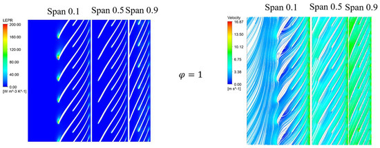 LEPR and streamline distribution at different blade spans under various flow coefficients for runner blades.