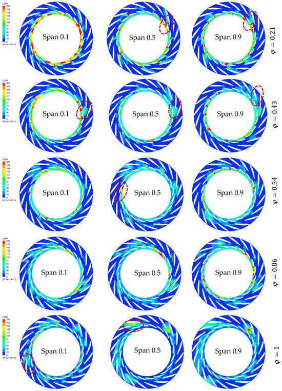 Visualization of LEPR distribution in the dual-blade-row cascade across spanwise sections under varying flow coefficients.