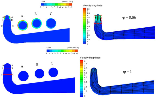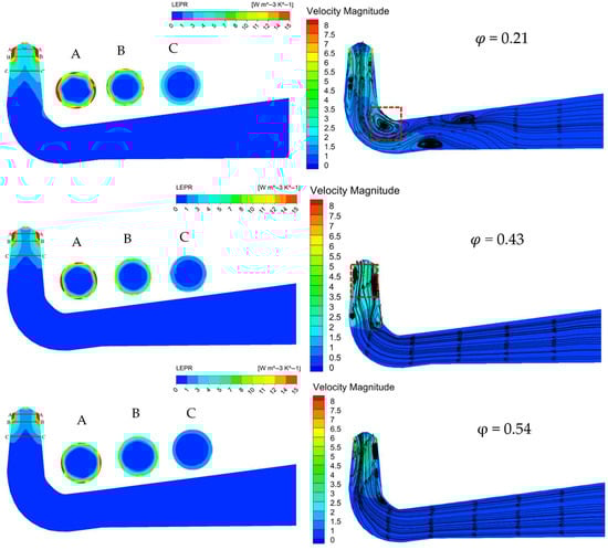 Figure 13 illustrates the entropy generation rate and streamline distribution across three axial planes (A-A, B-B, C-C) within the draft tube’s conical diffuser section. These cross sections reveal the spatial variation and distribution characteristics of entropy generation. From the streamline diagram, it can be seen that, at the optimal operating point and the point with larger flow rate, due to relatively stable flow, the streamlines are relatively smooth, and no vortex structure appears. The entropy generation distribution diagram reveals the absence of high entropy generation zones within the core flow region of the draft tube. Across the axial cross sections (A-A, B-B, C-C), the transverse entropy generation rate exhibits non-uniform distribution yet maintains an overall circular pattern. During the propagation process from downstream, the entropy generation rate gradually decreases. At the optimal operating condition with φ = 1 and the flow point, the flow state in the tail water chamber is stable, and there is no vortex structure. As the flow rate decreases, when φ = 0.54, non-uniform streamline distribution is observed at the draft tube outlet, with primary energy losses concentrated in the conical diffuser section. Analysis of flow simulation results reveals that secondary flows form under the influence of centrifugal forces and wall viscous effects within this section. Notably, the flow rate exhibits an inverse relationship with circulation scale: smaller flow rates correspond to larger circulation patterns. When the flow rate decreases to φ = 0.21, circulation emerges near the wall of the conical diffuser outlet. The circulation center shifts closer to the central axis of the diffuser, and the inception point of circulation advances toward the elbow section, forming high hydraulic loss zones along the circumferential wall surfaces. Under low-flow conditions, reduced flow velocity promotes wall separation in both the conical diffuser and elbow sections, generating large-scale vortices and backflow that induce significant entropy generation losses.