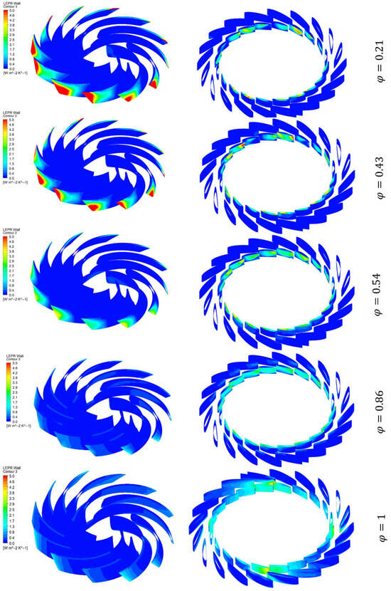 As the sole rotating component in the pump-turbine, the runner exhibits highly complex fluid dynamics due to its blade geometrical distortions. During operation, energy dissipation from water–wall interactions across hydraulic components contributes to hydraulic losses. As fluid sequentially interacts with guide vanes and runner blades, wall entropy generation on the runner blades was systematically investigated, with the results illustrated in Figure 14. As shown in Figure 14, the wall entropy generation areas on the runner blades are primarily distributed at the inlet and outlet edges, gradually decreasing toward the blade’s central region. Within the flow coefficient range of φ = 0.21–0.53, significant entropy generation is observed at the blade trailing edge outlets, with the maximum entropy generation occurring at the minimum flow point. As the flow rate increases, the entropy generation intensity progressively diminishes. The high entropy generation intensity at the runner blade trailing edge outlets is mainly attributed to the impact phenomena that occur when water flows through the runner at the blade leading edge, resulting in relatively high entropy generation losses. Within the flow coefficient range of φ = 0.86~1, increasing flow rates lead to heightened entropy generation intensity on the pressure surface of fixed guide vanes, with high-entropy regions predominantly concentrated near the trailing edge. This phenomenon results from both the formation of larger attack angles between partial flow streams and the cascade blade and rotor–stator interactions between the runner and movable guide vanes, which induce flow impingement against the pressure surface and trailing edge regions.