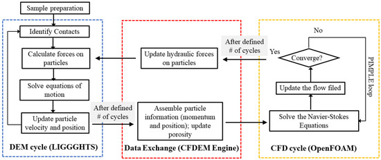 The fluid typically involves multiphase interactions between water and air phases in geotechnical processes such as excavation. To simulate these multi-phase processes, this study developed an improved CFD-DEM software based on the open-source software. The discrete particles were mimicked by the LAMMPS improved for general granular and granular heat transfer simulations (LIGGGHTS) software (v3.8) [26], and the fluid flow was simulated by the Open Field Operations and Manipulation software (OpenFOAM) software (v5.x) [27]. The software has been widely used for the simulation of particle flow and fluidized bed [28,29]. The following graph gives the coupling procedures of the software. The information about the particles is calculated from the DEM solver first and passed to the CFD solver for determining the corresponding cell. For each cell, on the basis of the particle volume fraction, it estimates the particle–fluid forces acting on each particle to determine the momentum exchange terms. The results are then returned to the DEM solver for updating the position of the particles and repeating the routines, as shown in Figure 1.