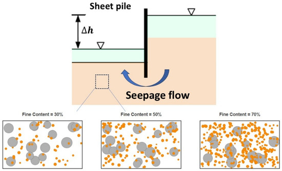 The multiphase nature of seepage phenomena necessitates comprehensive simulation approaches capable of accurately representing the coupled behavior of solid particles and fluid flow, leading to the emergence of computational fluid dynamics (CFD)-DEM coupling as a predominant framework for investigating solid–fluid system mechanics. Tsuji et al. [19] pioneered the application of this coupled technique for fluidized bed modeling, which was then widely employed in geotechnical applications, including landslide dynamics [20,21,22] and liquefaction phenomena [23]. Concerning internal erosion, Kawano et al. [24] demonstrated significant reductions in coordination numbers under fluid flow influence, particularly for mobilized fine particles, highlighting the critical role of fluid–particle interactions in altering granular fabric. More recently, Liu et al. [25] utilized CFD-DEM simulations to investigate suffusion mechanisms in underfilled gap-graded sandy gravels, revealing that particle contact evolution provides fundamental insights into the suffusion phenomenon. These findings collectively demonstrate the efficacy of CFD-DEM coupling in capturing the complex hydro-mechanical processes governing internal erosion, providing detailed insights into particle-scale mechanisms that are difficult to observe experimentally.