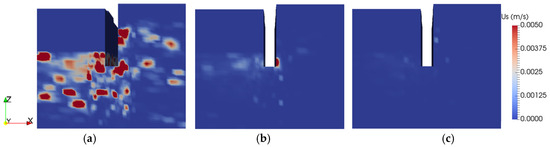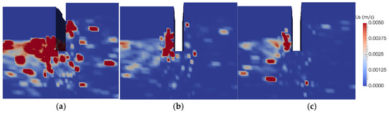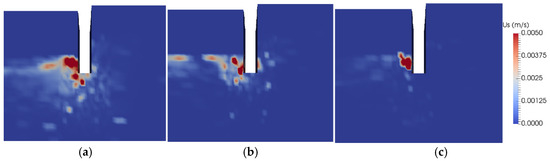 Spatial distribution of particle velocity at t = 0.1 s for h = 0.06 m. (a) Sample FC30; (b) Sample FC50; (c) Sample FC70.
