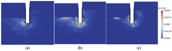 Figure 3 illustrates the spatial distribution of the particle velocity field for the three samples with varying fine contents at t = 0.1 s under a hydraulic head of h = 0.06 m. The velocity magnitude contours reveal different erosion patterns, with Sample FC30 exhibiting pronounced localized particle mobilization near the sheet pile interface, while Sample FC70 demonstrates significantly reduced particle mobilization throughout the domain. The results indicate that increasing fine content enhances erosion resistance through a reduction in particle velocities. Furthermore, the higher velocity observed adjacent to the sheet pile wall, in particular for Sample FC50, suggest that the hydraulic erosion preferentially initiates particle detachment at the upstream side. Subsequently, the erosion process propagates to the downstream side, developing preferential flow channels and enhancing particle mobilization.