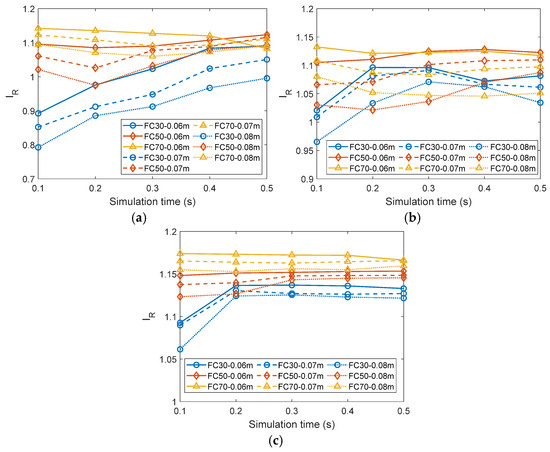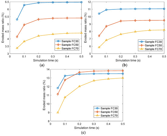 The eroded mass ratio serves as a fundamental parameter for characterizing seepage-induced erosion behavior. Following the criterion established by Xiao and Wang [31], the particles are classified as eroded when the drag force exceeds the particle weight. The eroded mass ratio is subsequently calculated as the cumulative mass of eroded particles normalized by the initial total mass. Figure 7 illustrates the temporal evolution of eroded mass ratio for the three samples subjected to different hydraulic gradients, revealing a pronounced inverse correlation between the initial fines content and the erosion resistance. Specimens with a lower fines content exhibit significantly higher eroded mass ratios, indicating reduced erosion resistance. Consistent with the particle velocity distributions shown in Figure 3, Figure 4, Figure 5 and Figure 6, Sample FC30 demonstrates rapid initial erosion development, achieving quasi-steady conditions within approximately 0.1 s under all hydraulic conditions. This behavior reflects the rapid formation of preferential flow channels in low-fines-content specimens, which facilitates enhanced fluid transport and rapid achievement of quasi-steady flow conditions. Conversely, specimens with a higher fines content (Sample FC50 and FC70) exhibit more gradual erosion progression, with Sample FC70 showing the most protracted transition to equilibrium conditions due to its denser soil matrix.