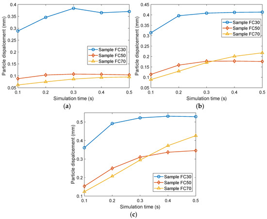 Figure 8 portrays the temporal evolution of the average fine particle displacement during the erosion process for the three samples subjected to varying hydraulic gradients. The results demonstrate a characteristic progression wherein the average fine particle displacement increases monotonically with simulation time until reaching quasi-steady conditions, exhibiting strong consistency with the erosion ratio behavior presented in Figure 7. A direct correlation exists between erosion resistance and particle mobility, with specimens exhibiting higher erosion ratios demonstrating correspondingly greater average fine particle displacements. Sample FC30 consistently shows the highest particle displacement across all hydraulic conditions. Additionally, higher hydraulic gradients induce progressively greater particle displacements. Notably, Sample FC70 exhibits distinctive behavior characterized by gradual but sustained particle migration. While initially demonstrating lower displacement rates compared to Sample FC50, the prolonged erosion process in FC70 ultimately results in higher average fine particle displacement at the final stage, particularly under higher hydraulic gradients. The results indicate that intensified hydraulic forcing can overcome the stabilizing effects of a higher fines content, resulting in sustained particle migration during the intermediate erosion phase and enhanced cumulative displacement despite initially superior erosion resistance.