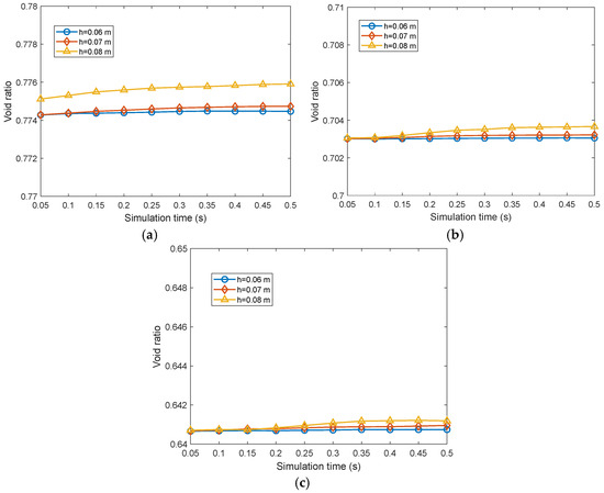 Temporal evolution of void ratio for samples under different hydraulic gradients. (a) Sample FC30; (b) Sample FC50; (c) Sample FC70.