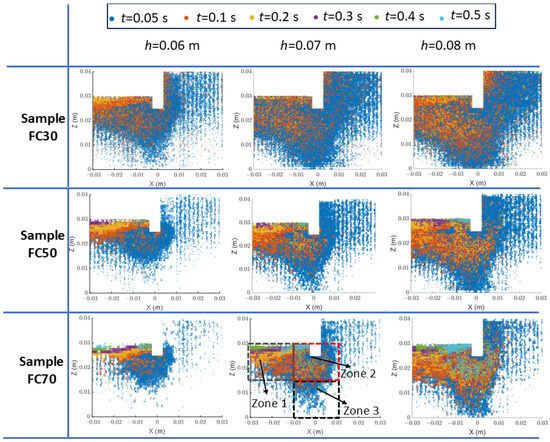 The cumulative particle displacement can be quantified as the summations of displacements across the discrete zones. Figure 11 portrays the temporal evolution of average particle displacement for the three zones across all specimens. The results demonstrate that particle displacement enhances with increasing hydraulic conditions for each zone. Furthermore, the results reveal that the enhanced displacement observed in Sample FC70 (Figure 8) is predominantly attributed to the mobilization of the particles within Zone 2.