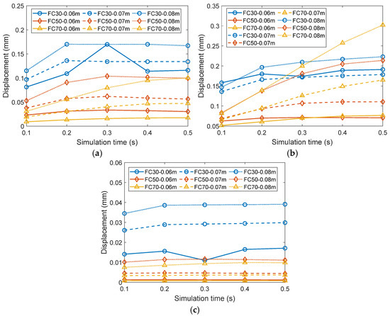 Temporal evolution of particle displacement for samples under different hydraulic gradients. (a) h = 0.06 m (b) h = 0.07 m; (c) h = 0.08 m.