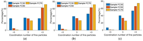 The coordination number (CN) serves as a fundamental parameter for characterizing the stability and connectivity of the soil skeleton structure, providing quantitative insight into the micromechanical behavior that governs macroscopic erosion resistance. Nie et al. [41] and Mu et al. [42] proposed that particles with a coordination number lower than 3 can be determined as unstable particles susceptible to migration under seepage flow. Based on the macroscopic erosion behavior observed previously, significant particle mobilization occurs predominantly during the initial stage of seepage erosion. Taking h = 0.06 m as an example, Figure 12 presents the probability distribution of the coordination numbers for the fine particles across the three defined zones at t = 0.1 s. Sample FC30 exhibits significant higher percentages of particles with CN < 3 for each zone, with Zone 1 showing the largest proportion of unstable particles. As the fines content increases, the particles achieve sufficient constraint through enhanced inter-particle connectivity. Sample FC70 demonstrates the most stable configuration, with approximately 1.3% of the particles with CN < 3 in both Zone 1 and Zone 2. For all samples, Zone 3 demonstrates the most stable conditions, correlating with the observed spatial distribution of the erosion patterns.