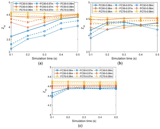 Temporal evolution of the mechanical coordination number for specimens in different zones. (a) Zone 1; (b) Zone 2; (c) Zone 3.