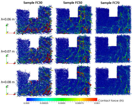 To further elucidate the micromechanical mechanisms underlying the onset of seepage erosion, the interparticle contact forces were analyzed. Taking Zone 2 as an example, Figure 15 portrays the force chains networks for the three specimens at t = 0.5 s. As a fines content increases, the network becomes intense while the magnitude reduces. After erosion, the force chain orientation predominantly rotates to align parallel to the preferential flow path, with strong contact forces concentrating on the upstream side across all specimens in Zone 2. The proportion of strong contact force reduces with the increase in the hydraulic conditions.