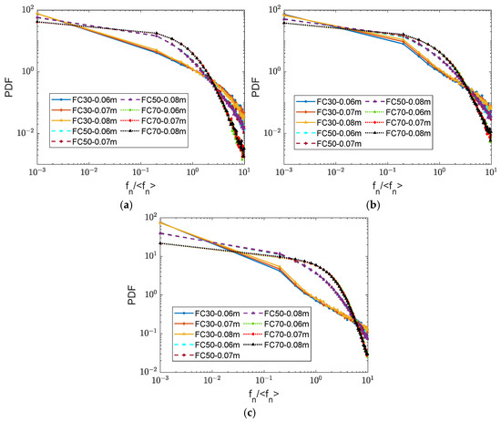 Following Radjai et al. [46] and Minh and Cheng [47], contact forces are categorized into strong and weak components, with strong contact forces defined as those exceeding , where refers to the average contact force of the specimen. Figure 16 and Figure 17 depict the probability distribution of normal contact forces across the three zones at t = 0.1 s and t = 0.5 s, respectively. The results reveal distinct behavior patterns dependent on the fines content. Sample FC30 exhibits similar probability distribution across all zones due to rapid development of erosion. Conversely, as the fines content increases, only Zone 3 maintains consistent probability distributions, particularly for Sample FC70. Regarding Zone 1 and Zone 2, Samples FC50 and FC70 demonstrate increased proportions of weak contact forces at t = 0.5 s, attributed to the gradual progression of seepage erosion. The weak contact force, combined with the lower mechanical coordination number in Zone 2, facilitates the development of erosion and results in the enhanced displacement observed in Sample FC70. These findings indicate that variations in the fines content would result in the stability problems at different zones within the soil skeleton.