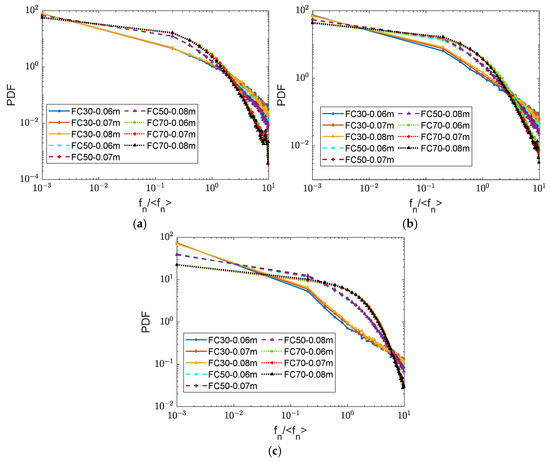 Log–log plots of the normal contact force distribution in different zones at t = 0.1 s. (a) Zone 1; (b) Zone 2; (c) Zone 3.