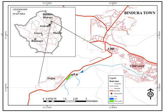The study was conducted in Bindura (17°30′18″ S and 31°19′49″ E), a town that is 90 km north-east of the capital city of Zimbabwe, Harare (Figure 1). The study area encompasses various sites within Bindura, including the sampling site indicated on the map (Figure 1) and Bindura University of Science Education, Astra campus, where laboratory experiments and analyses were conducted. Bindura is characterised by hot, dry and wet summers (September–March) and cold, dry winters (May–August). The town receives an average annual rainfall of 810 mm, and the mean daily temperature range is 12–26 °C.