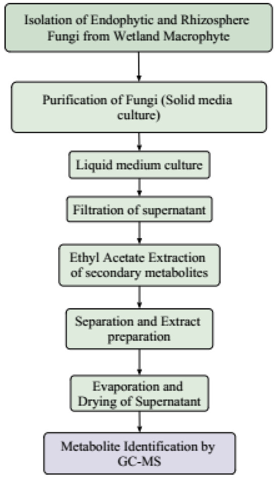 Recent studies have highlighted the potential of fungi, particularly endophytic and rhizosphere fungi, to contribute to the remediation of wastewater in CWs. Endophytic fungi are found in plants and help the host plant cope with biotic and abiotic stressors [40]. It is known that these microbes live inside plant tissues without seeming to affect the host [41]. The fungal endophytes reportedly produce a vast range of secondary metabolites, with many compounds having antibacterial activity [41,42,43]. For instance, Sundar and Arunachalam [44] isolated secondary metabolites from the endophytic Fusarium oxysporum TPL11 fungus of the Tradescantia pallida plant. Among the metabolites produced was the phenolic compound, 2,4-di-tert-butylphenol (DTB), which exhibited antagonism against human pathogens [44]. These results support earlier findings by Juan et al. [45], which revealed that endophytic fungi isolates from Dendrobium devonianum and D. thyrsiflorum exhibited antimicrobial activity against at least one pathogenic bacterium or fungus. This has sparked the interest of numerous researchers, though much of the focus has been on exploring the diversity of fungi associated with medicinal plants and investigating the bioactivity of the secondary metabolites they produce [3,41,46]. Alkaloids, steroids, terpenoids, flavonoids, glycosides, xanthones, isocoumarins, quinones, phenyl propanoids, lignans, aliphatic metabolites, and lactones are among the secondary metabolites of fungal metabolism that are commonly isolated in plants that harbour these fungi [47]. These findings reinforced the assumption that endophytic and rhizosphere fungi could play a potential antibacterial role in the treatment of wastewater in CWs.