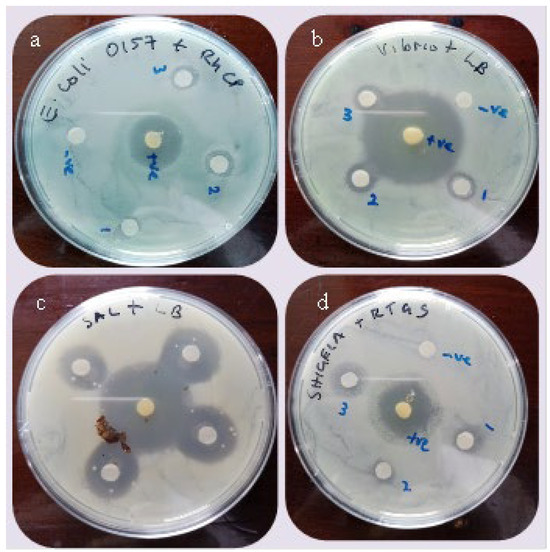 Using the disc diffusion method as outlined by Marcellano et al. [46], the antibacterial activity of the crude ethyl acetate extracts was evaluated. The disc diffusion method has been used in this study because of its relative simplicity and ability to easily test multiple antimicrobial agents on each bacterial isolate [52]. Twenty-four-hour-old cultures were used to create test bacterial suspensions. Based on the 0.5 McFarland Standard, the concentrations of bacterial suspensions were standardised to contain roughly 1.5 × 108 CFU/mL cells. Then, 100 µL of each standardised bacterial suspension (E. coli O157: H7, Salmonella spp., Shigella spp. and Vibrio spp.) was spread on Mueller–Hinton Agar (MHA). An inoculum was prepared by dissolving dried crude ethyl acetate extract in 0.1% dimethyl sulfoxide (DMSO) to achieve a 100 mg/mL concentration. After that, sterile circular discs (produced from Whatman Paper No. 1 filter paper), with a diameter of 5 mm, were eluted with 30 µL of the dissolved extract and left to dry for an hour. For each extract, four paper discs were placed and positioned at an equal distance apart on the bacteria-inoculated MHA agar plates. Additionally, gentamicin discs and paper discs eluted with 30 µL of 0.1% DMSO were added to the MHA plate as positive and negative controls, respectively. The plates were sealed with parafilm and incubated for 24 h at a temperature of 37 °C. The zones of inhibition that established during incubation were measured using a ruler.