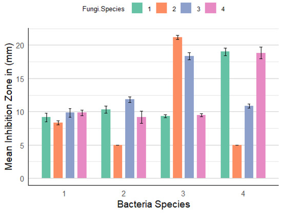 Pairwise comparisons between species of fungi within the E. coli bacteria produced p-values ≥ 0.05, signifying that there is no single fungal species that is more effective against E. coli than others. Pairwise comparisons between species of fungi within the Shigella spp. produced p-values that are significant. The p-values for the species RTGS–RTGRS (<0.0001), RTGRS–LB (<0.0001), RTGRS–RHCP (<0.0001) and LB–RHCP (0.0021) are significant. The significant contrasts between fungal species RTGRS and LB and between LB and RHCP confirm that species LB’s inhibition zone (11.83) is significantly higher than the other fungal species, reinforcing its status as more effective than RTGRS and RHCP. There was no significant contrast reported between species RTGS and LB, which means that they could be statistically similar. However, the mean inhibition zone for species LB is higher than RTGS (11.83 vs. 10.33); thus, fungal species LB remains the most effective species in inhibiting Shigella spp.