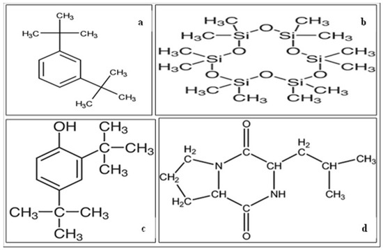 Chemical structures of major secondary metabolites detected in ethyl acetate extracts: (a) Benzene, 1,3-bis(1,1-dimethylethyl), (b) Cyclohexasiloxane, dodecamethyl, (c) 2,4-Di-tert-butylphenol, (d) Pyrrolo[1,2-a]pyrazine-1,4-dione, hexahydro-3- (2-methylpropyl).