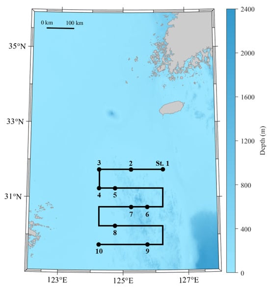 Surveys were conducted in the East China Sea using Chonnam National University’s training vessel Saedongbaekho (G/T 2996 T). Seasonal surveys were conducted in April, July, August, and November 2022 (Figure 1), covering a total survey area of approximately 33,104 km2.