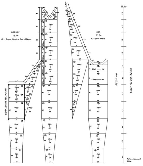 In this study, the fishing catch survey was conducted using a bottom trawl net installed on the training vessel Saedongbaekho of Chonnam National University (Figure 2). The total length of the bottom trawl net was 50.2 m, with a width of 26.5 m and a height of 2.5 m. The codend (terminal section of the trawl) measured 8.6 m in length, 2.2 m in width, and 1.5 m in height. The codend was constructed with a double-layered net structure consisting of inner and outer nets. The mesh size of the inner net was 120 mm, while that of the outer net was 240 mm. The outer net helped maintain the overall shape of the codend and supported mesh opening consistency in the inner net, thereby allowing the escape of juveniles and small-sized fish while also protecting the net from abrasion from the seabed. In contrast, the inner net, composed of finer mesh, served to retain adult fish by preventing their escape after entry.