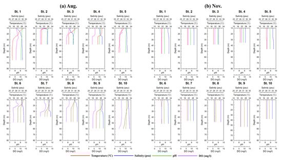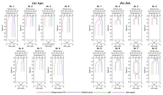 Marine environmental factors influence the distribution of marine organisms and fish resources. Therefore, a seasonal (monthly) marine environmental survey was conducted in the East China Sea in April, July, August, and November 2022, using a CTD profiler with a water sampler (SBE 911 Plus, Sea-Bird Scientific, Bellevue, WA, USA) (Figure 3 and Figure 4).