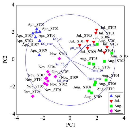 Principal component analysis (PCA) biplot showing the influence of environmental variables (dissolved oxygen, temperature, salinity, and pH at surface and 20 m depth) on the sampling sites during four different months: April (▲), July (▼), August (■), and November (◆). Blue lines represent the contribution of each environmental parameter to the principal components PC1 and PC2.