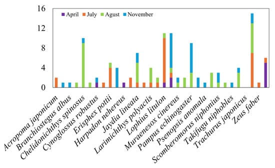 In April, demersal crustaceans such as Ovalipes punctatus and Portunus trituberculatus were dominant, whereas in July–August, pelagic fish species, including Trachurus japonicus, Trichiurus lepturus, and Scomber japonicus, were relatively abundant. In November, species adapted to the low temperature and high-salinity conditions, such as members of the family Sciaenidae and Pampus argenteus, were commonly observed, characterizing the autumn fish assemblages.