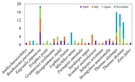 In November, the average densities of the dominant species were 0.057 g/m2 for Thunnus orientalis, 0.057 g/m2 for T. alalunga, and 0.013 g/m2 for E. japonicus.