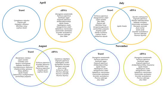 When comparing the results of the eDNA and trawl surveys, notable overlap in species composition was observed only in August, while the other months showed minimal overlap (Figure 8). Most species were independently detected by either method. These discrepancies likely reflect methodological differences in detection sensitivity, habitat depth coverage, species behavior, gear selectivity, and the dispersal characteristics of eDNA in the marine environment.