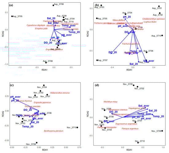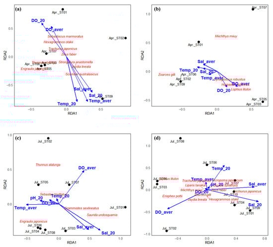 Redundancy analysis (RDA) plots showing the relationships between fish species composition, environmental variables, and sampling stations in the East China Sea in April (a,b) and July (c,d), 2022. Panels (a,c) present results from eDNA metabarcoding, while panels (b,d) show results from bottom trawl surveys. Environmental variables (blue arrows) include temperature (Temp_aver, Temp_20), salinity (Sal_aver, Sal_20), dissolved oxygen (DO_aver, DO_20), and pH (pH_aver, pH_20). Fish species are labeled in red, and black dots represent sampling stations. The RDA plots illustrate seasonal and methodological differences in species–environment associations and highlight depth-related biases between surface-oriented (eDNA) and bottom-oriented (trawl) detection methods.