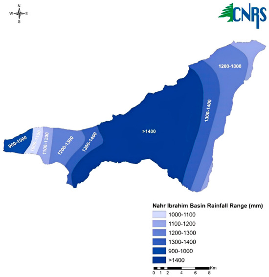 Map showing the precipitation rates of several sub-basins of the Ibrahim River (source: Lebanese National Council for Scientific Research—Lebanon CNRS).