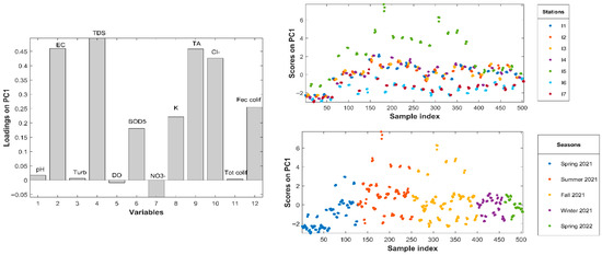 PCA was applied to analyze the spatio-temporal variation of the water quality along the Ibrahim River. This technique reduces dimensionality by replacing original indicators (variables) with new comprehensive indicators (PCs). The amount of information enclosed in each PCs is quantified by the explained variance percentages [21]. PCA was performed on the data matrix X (504 × 12), retaining two principal components (PC1 and PC2) that collectively explain about 45% of the original variance. Visualizing scores corresponding to the 504 samples helps in identifying potential spatial or temporal trends across river sampling stations and seasons. PCs loadings, derived from the 12 study variables (pH, EC, TDS, DO, BOD5, NO3−, K+, TA, Cl−, Tot Colif, and Fec Colif), reveal which variables drive the observed patterns in the scores.