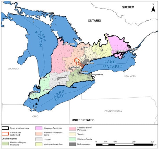 Map of the southern Ontario study area, including the delineated geographical regions of the lower province. Major cities and built-up areas are shown for spatial reference. The Credit River watershed, selected for the watershed-scale vulnerability comparison, is highlighted in red.