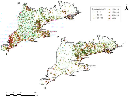 The highest average groundwater concentrations (250 to 5000 mg/L) within southern Ontario for both decades (Figure 4a,b) were typically observed near main urban centres (e.g., GTA, Barrie, Sarnia, and Niagara region) and the central east (Kingston–Pembroke) region of Ontario (Figure 4). Between 2001 and 2010 (Figure 4a), concentrations above 250 mg/L were recorded predominantly in southwest (London and Windsor–Sarnia), central west regions (Kitchener–Waterloo–Barrie and Toronto), and the GTA. Notably, elevated concentrations measured in the southwest, particularly between Sarnia and Chatham, occurred in areas characterized predominantly by rural land use.