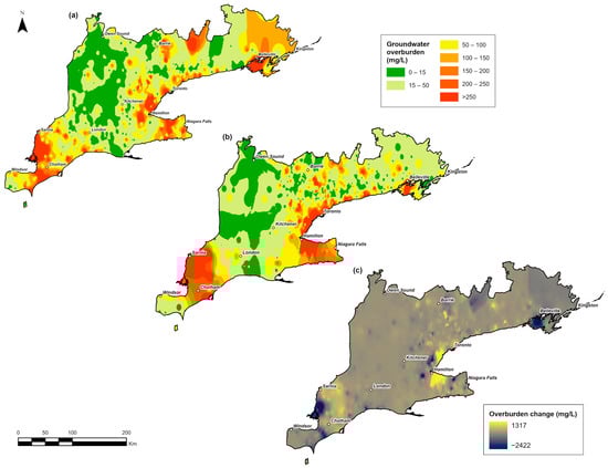 Separating the overburden from bedrock monitoring locations enabled a comparison of Cl− trends across different geological materials. Overburden concentrations in 2001–2010 mirrored general trends, with guideline exceedances near Sarnia, Chatham, Niagara Falls, the Golden Horseshoe, and Kingston (Figure 5a). By 2011–2020, these zones expanded, with intensified hot spots in the GTA, Lake Ontario corridor, Sarnia–Chatham, and Niagara (Figure 5b). The compute-change GIS tool estimated a decadal range from a 2422 mg/L decrease in some locations to a 1317 mg/L increase (Figure 5c).