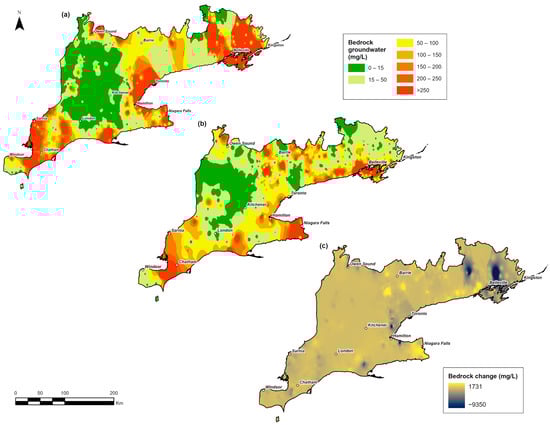 Bedrock aquifer patterns in 2001–2010 were comparable to those in the overburden, with locally elevated zones in Kingston–Pembroke, GTA, and southwestern Ontario (Figure 6a). In 2011–2020, bedrock concentrations became more variable with a greater number of scattered hotspots (Figure 6b). Estimated changes showed a maximum 1731 mg/L increase and a maximum 9350 mg/L decrease (Figure 6c). However, the apparent decrease in concentrations during 2011–2020 may partially reflect changes in monitoring density and spatial coverage. While high concentrations persisted in certain areas, the addition of new monitoring wells, particularly in surrounding regions with lower Cl− levels, may have reduced the influence of earlier, more localized hotspots in the interpolated surfaces. As a result, observed declines in regional averages or hotspot intensity may not reflect real improvements in water quality, but instead reflect changes in how and where sampling was conducted.