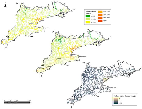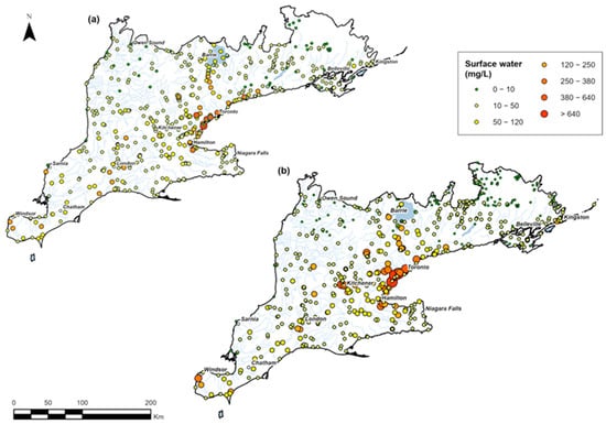 Following the pattern observed in groundwater, average surface water Cl− concentrations over the two decades were highest near urban centres (Figure 7a,b). Elevated concentrations were consistently observed in the GTA, Kitchener–Waterloo, Hamilton, and Windsor areas in both 2001–2010 and 2011–2020.